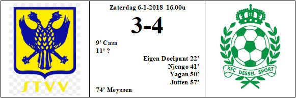 11′ Dessel mist duidelijk zijn start. Remen wil een lange bal wegkoppen, maar via het lichaam van een tegenstander komt de bal voor de voeten van de nummer 5 (zijn nummer staat niet op het wedstrijdblad dus een naam hebben we even niet) van STVV, hij kan alleen door op Kustermans en plaatst de bal langs de doelman in het doel.