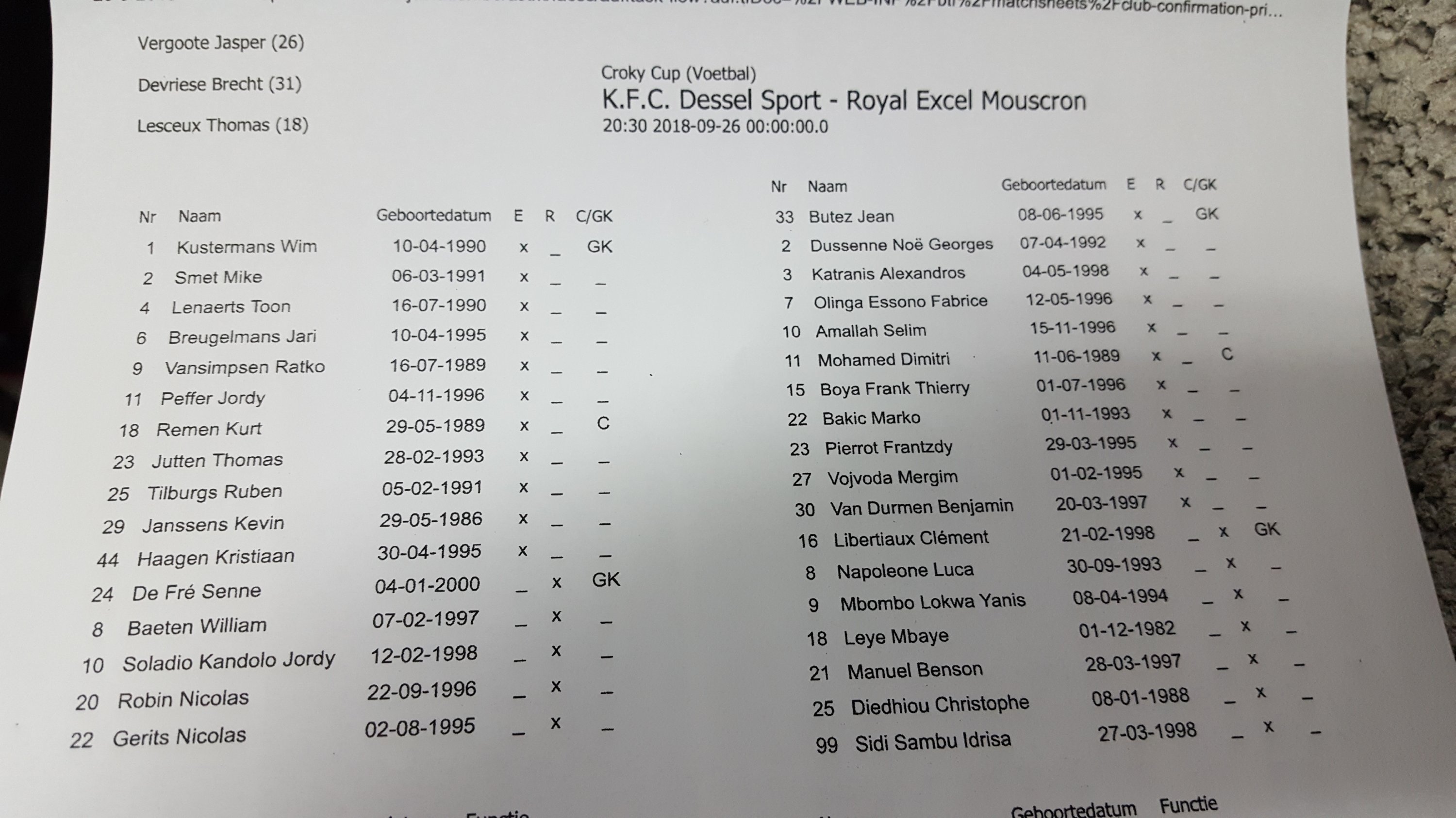 46′ De tweede helft is begonnen. Baeten komt bij Dessel in de ploeg voor de geblesseerde Remen.