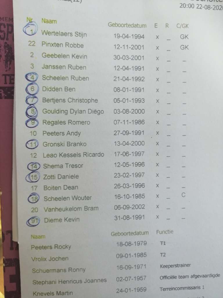 46′ We zijn aan de tweede helft begonnen. Bij Dessel staan dezelfde 11 spelers op het veld, bij de thuisploeg is zover we kunnen zien een vrijwel volledig nieuwe ploeg op het veld gezet. Alle namen die niet omcirkeld zijn op het wedstrijdblad, plus nog enkele namen die daar niet op stonden.