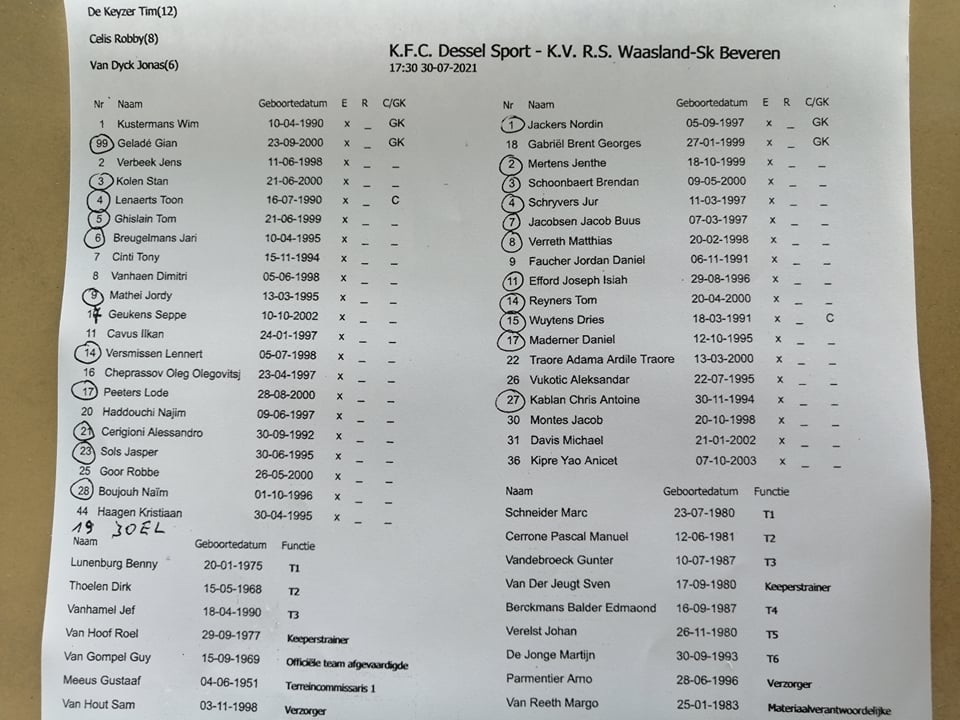 71′ Dessel wisselt het volledige elftal, op de doelman na. Het volgende team staat nu in het veld: Geladé – Goor Haagen Cavus Verbeek – Vanhaen Haddouchi Geukens – Elemva Cheprassov Cinti.