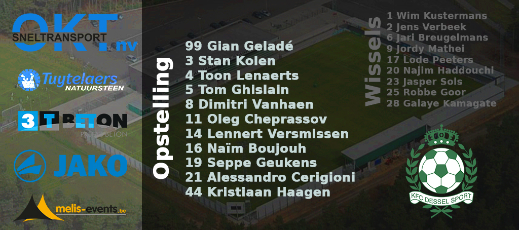 Bij Dessel zijn Boujouh, Cerigioni, Geukens, Vanhaen, Versmissen en Lenaerts vervangen door Haddouchi, Kamagate, Peeters, Breugelmans, Sols en Goor.