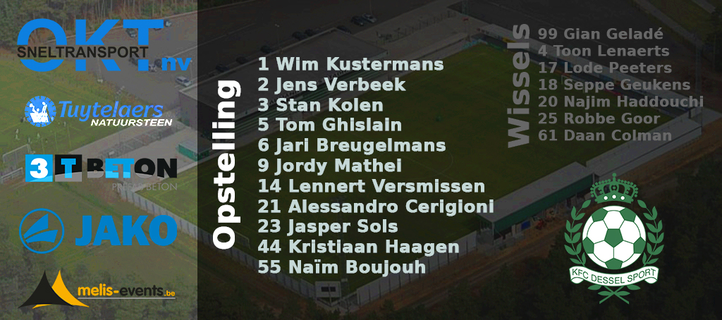 46′ We zijn aan de tweede helft begonnen. Bij Dessel is Cerigioni in de kleedkamers achter gebleven, voor hem is Peeters in de ploeg gekomen.
