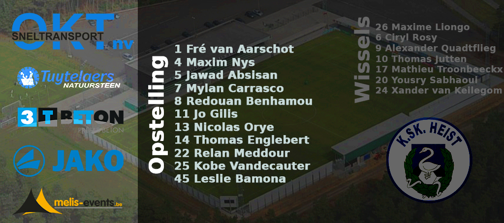 10′ Niet lang na de aftrap is het opnieuw Breugelmans met een kans. De aanvaller komt tussen enkele Heistse verdedigers vrij en probeert met een lob de doelman te verschalken, de bal is helaas nog in het bereik van Van Aerschot en hij kan naar de zijkant duwen.