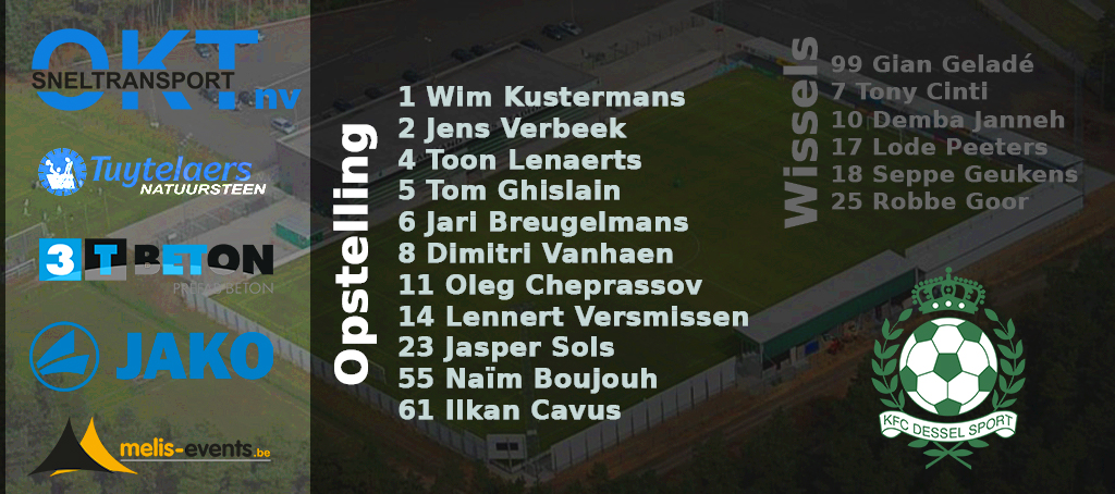 46′ We zijn aan de tweede helft begonnen. Bij Dessel zijn Kustermans, Lenaerts en Ghislain in de rust vervangen door Geladé, Demba en Cinti. Bij de thuisploeg is Blockx in de ploeg gekomen voor Van Genechten.