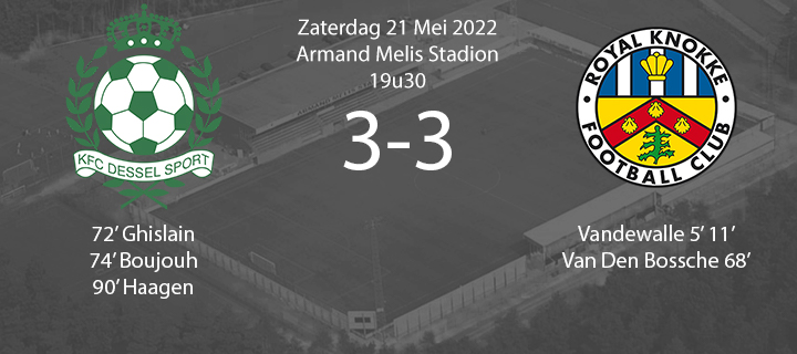 De arbiter fluit voor het einde. In een hele leuke match voetbal was Dessel na het eerste kwartier veruit de betere ploeg en had het hier altijd de winst moeten pakken, helaas werden er teveel kansen gemist en moeten we met een gelijkspel genoegen nemen. De prestatie zelf en het spel in vooral de tweede helft is wel iets om trots op te zijn. Na een moeilijke match afgelopen woensdag en een 0-3 achterstand vanavond wist de ploeg zich prachtig en zeer verdiend terug te knokken!