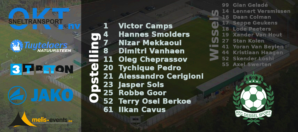 18′ De match begint met een uitgebreide studieronde. Dessel heeft veel de bal, maar kan nog geen kansen bij elkaar spelen.