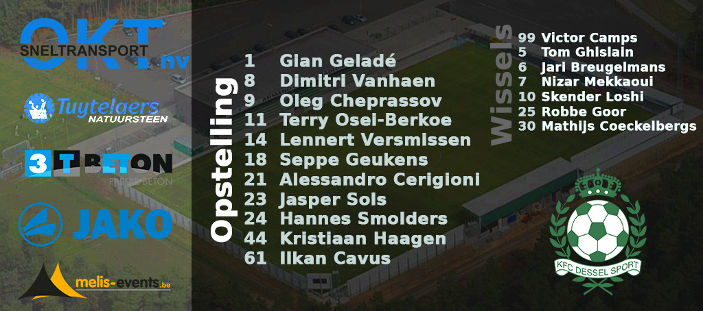 32′ Dessel probeert een mooie variant op hoekschop. Vanhaen ineens op Versmissen, die buiten het strafschopgebied klaar staat om te trappen, hij jaagt de bal over de reclameborden.