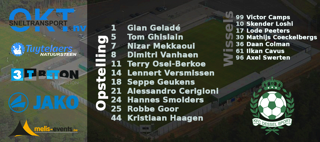46′ We zijn aan de tweede helft begonnen. Bij Dessel is Goor in de kleedkamer achter gebleven, Swerten is zijn vervanger.