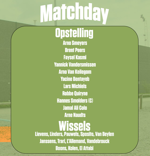 De bezoekers hebben op de ingevallen Bafdili en doelman Van Ingelgom na ook negen nieuwe namen ingebracht en spelen als volgt: Van Ingelgom, Caicedo, Bouazzaoui, Onstein, Tran, Bafdili, Wamu, Driessen, Toure, De Wannemacker, Mirasola.